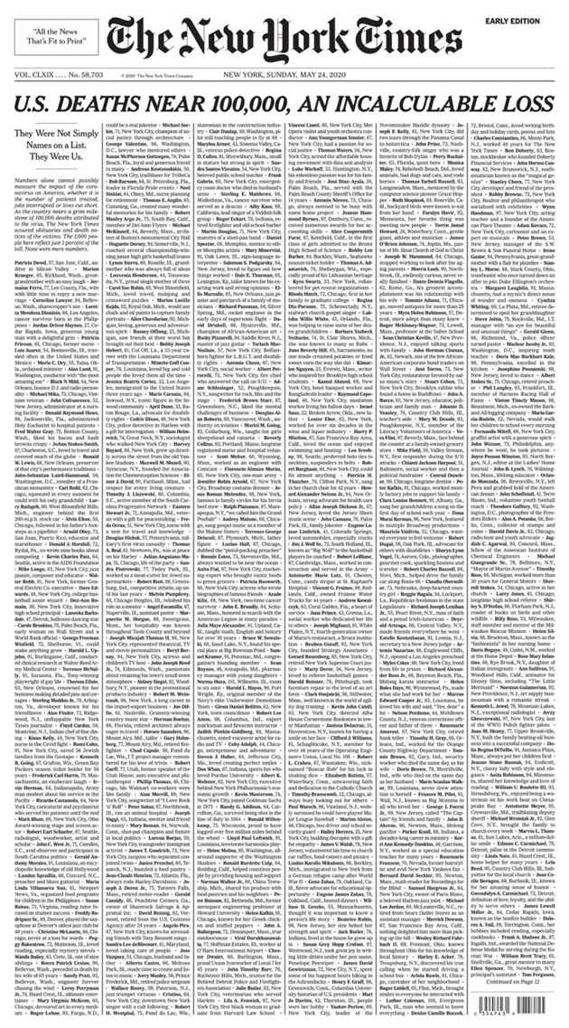 Nyt Honors Coronavirus Victims With Powerful Front Page On Memorial Day Weekend The Front Page Of The New York Times Sunday Edition Will Feature The Names Of Approximately 1 000 Victims Of The Coronavirus Pandemic The Partial List Represents Just One
