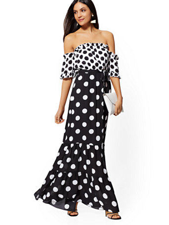 Ny C Black White Dot Print Off The Shoulder Maxi Dress www.nyandcompany.com