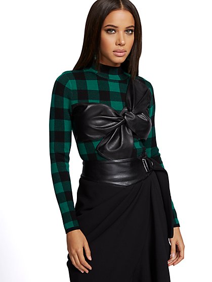 Ny C Faux Leather Accent Plaid Sweater www.nyandcompany.com