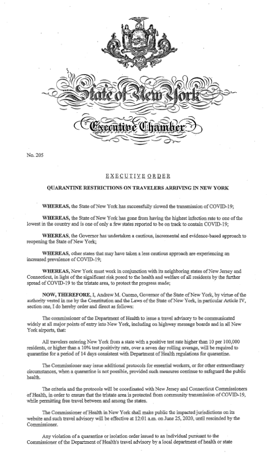 No 205 Quarantine Restrictions On Travelers Arriving In New York