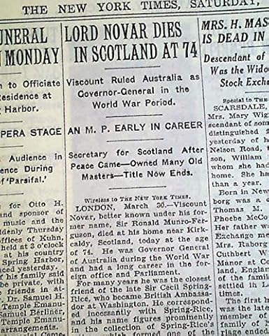 Amazon Com Ronald Munro 1st Viscount Novar Governor General Of Australia Death 1934 News The New York Times March 31 1934 Entertainment Collectibles
