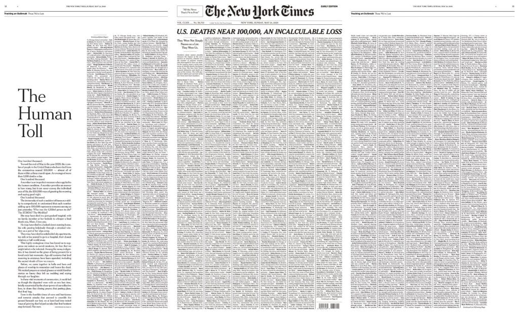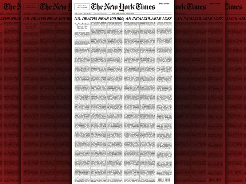 New York Times Covers Front Page With 1 000 Covid 19 Death Notices