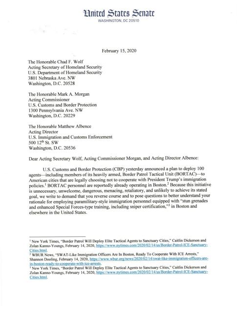 Markey Warren Letter On Border Patrol Deployments www.gloucestertimes.com