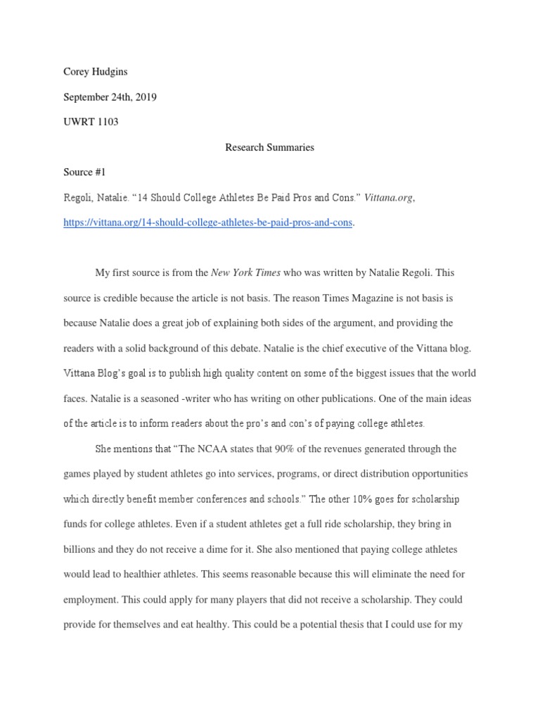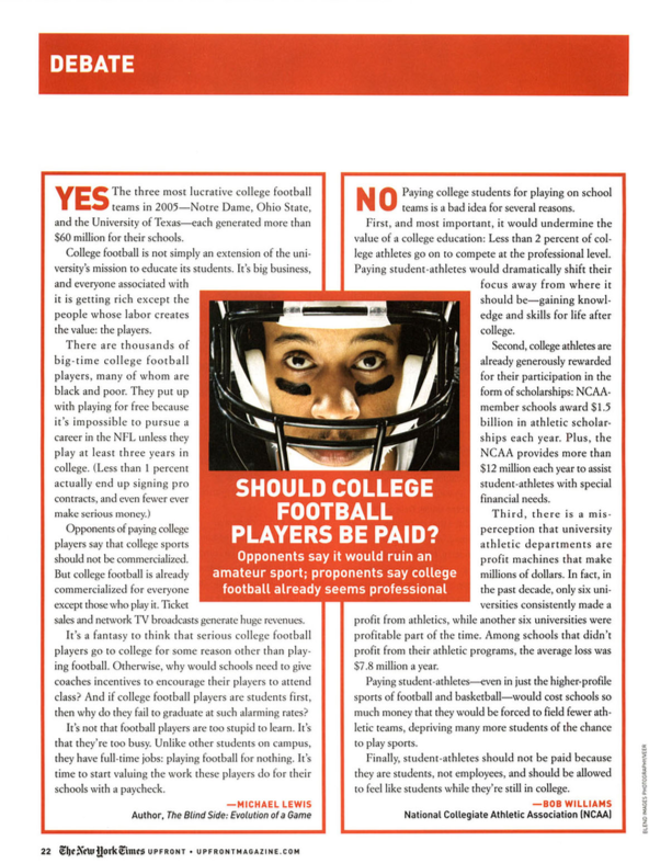 However the best approach would be to pay athletes for their contributions to the ncaa. College athletes should be paid because they work so hard but receive severe injuries instead of money they train so hard each day so they can play each game at their very best and the ncaa. Magazine article new york times upfront.