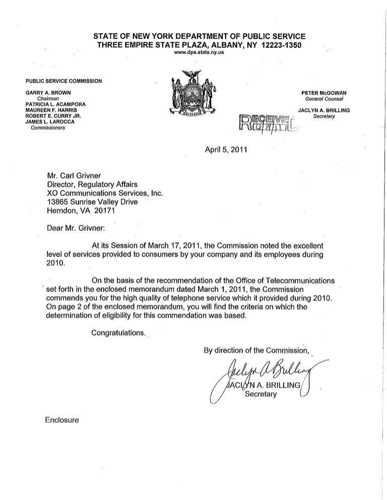 Commendation From The New York Public Service Commission For Excellen